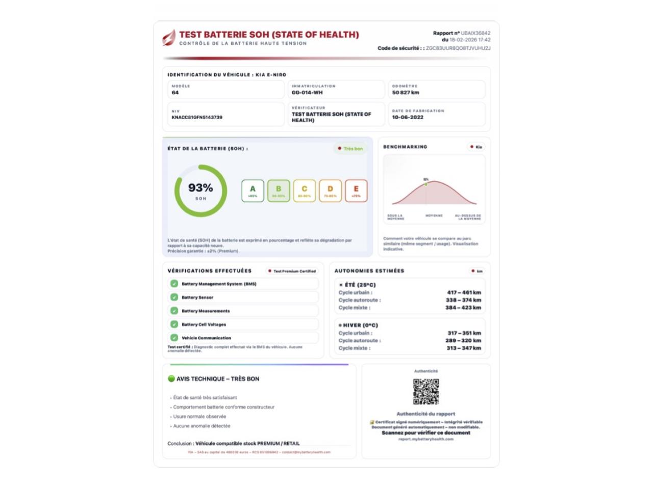 - Test batterie certifié SOH : 93 %