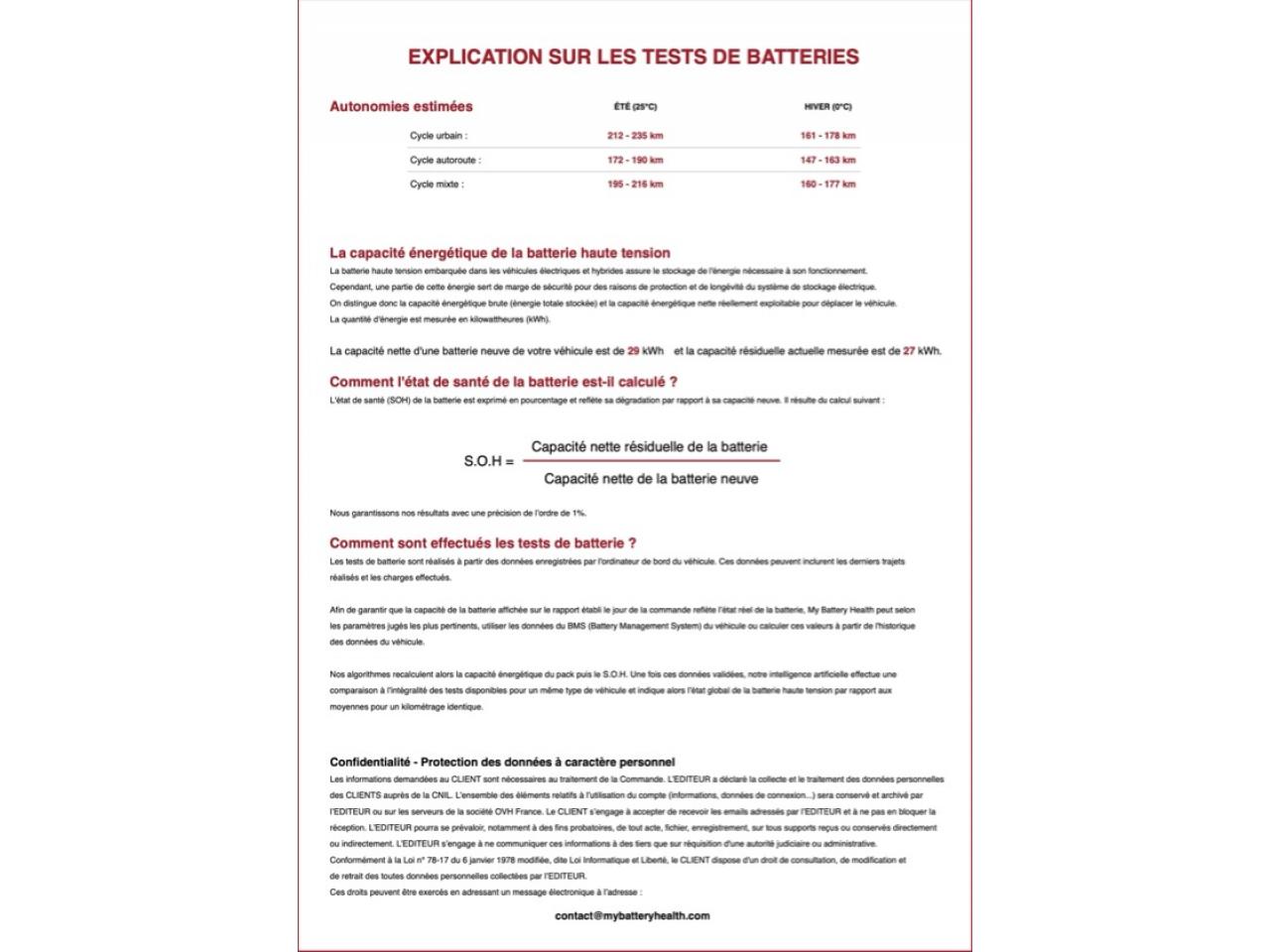 - Rapport test batterie certifié SOH "My Batterie Health" (détail complet dans les photos): 92 %