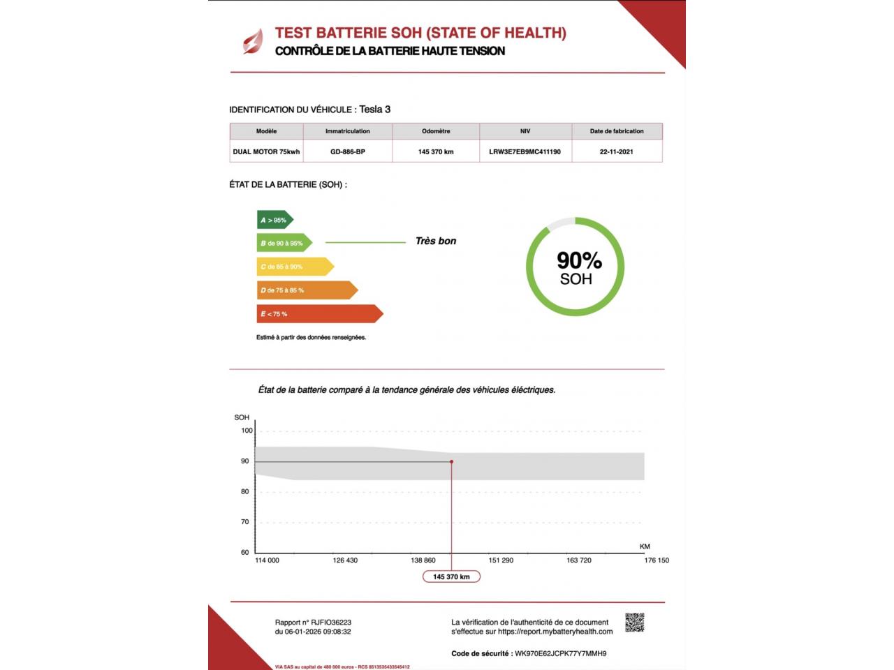 - Rapport test batterie certifié SOH "Aviloo" (détail complet dans les photos): 90 %