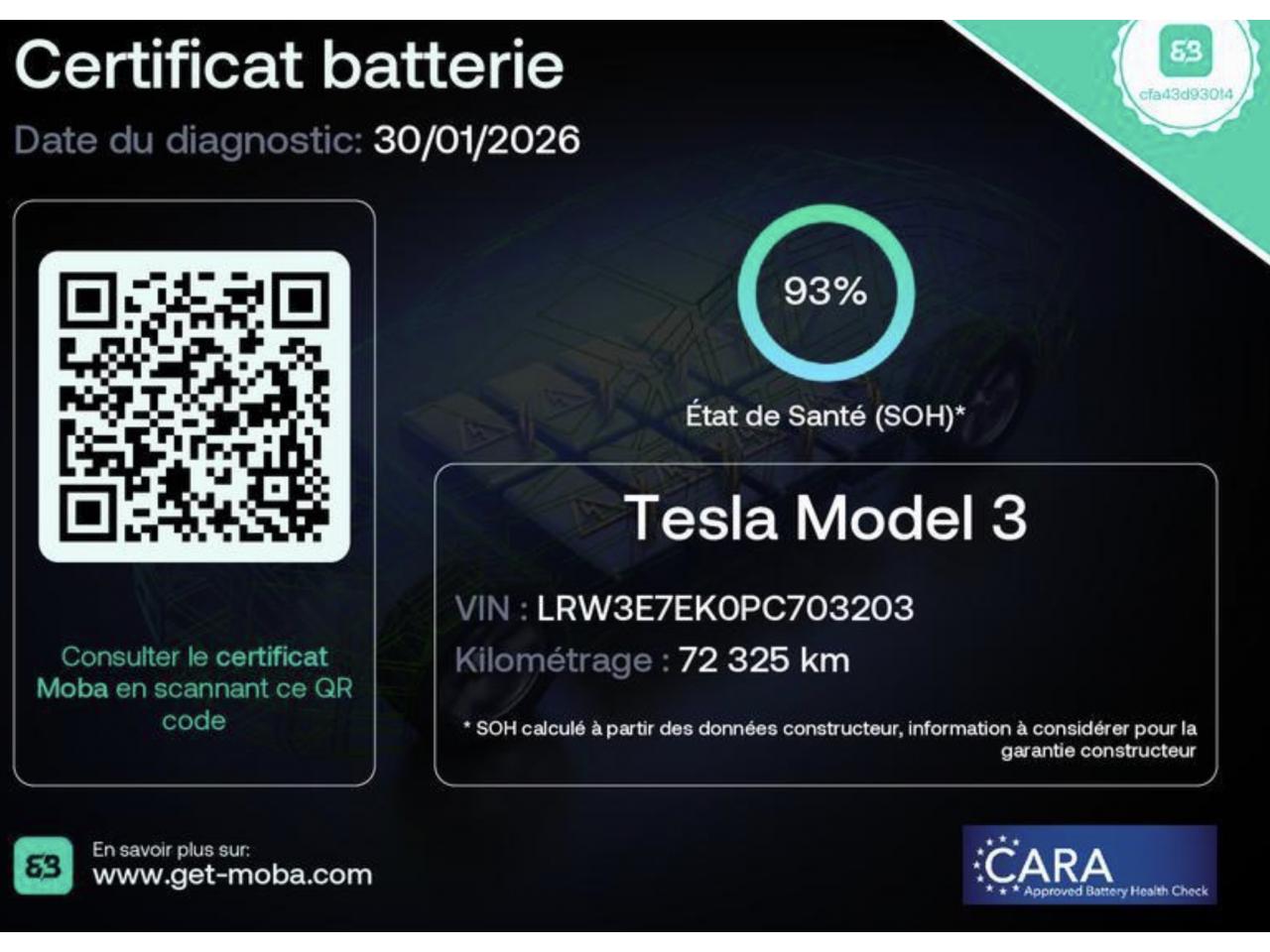 - Test batterie certifié SOH : 93 %