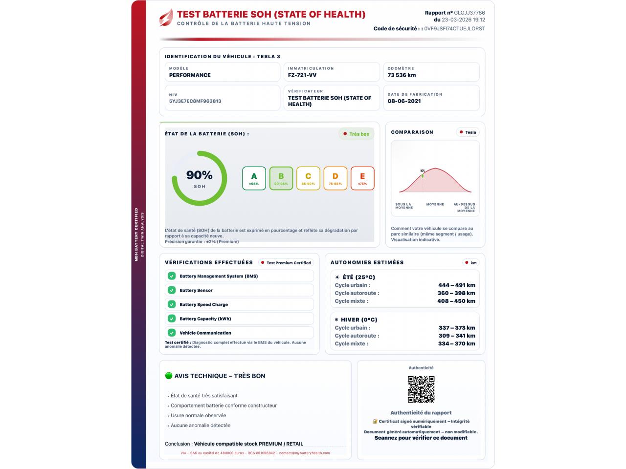 - Test batterie certifié SOH : 90 %