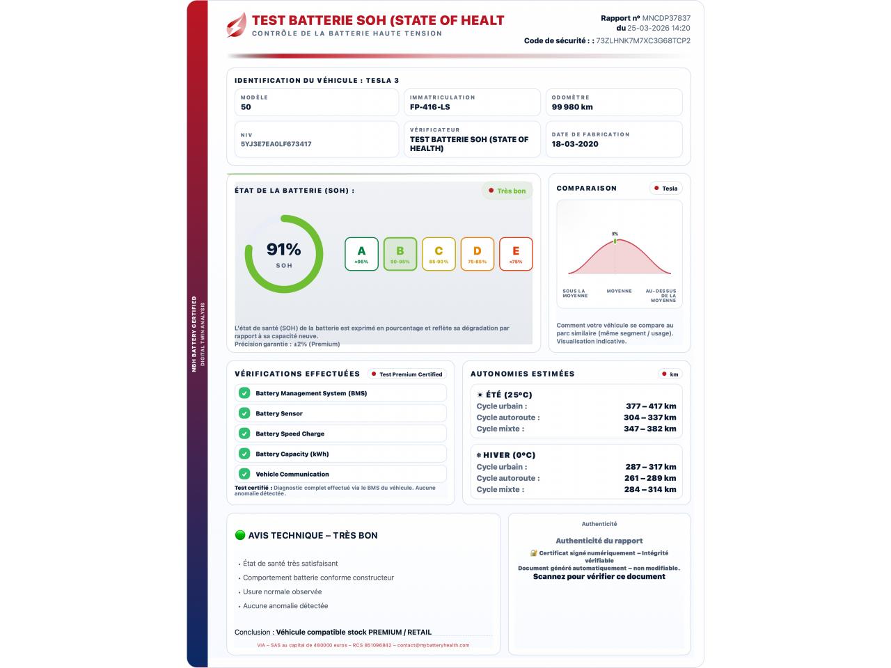 - Test batterie certifié SOH : 91 %
