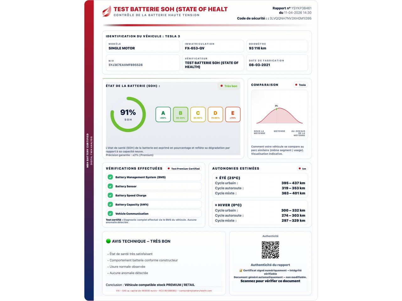 - Test batterie certifié SOH : 91 %