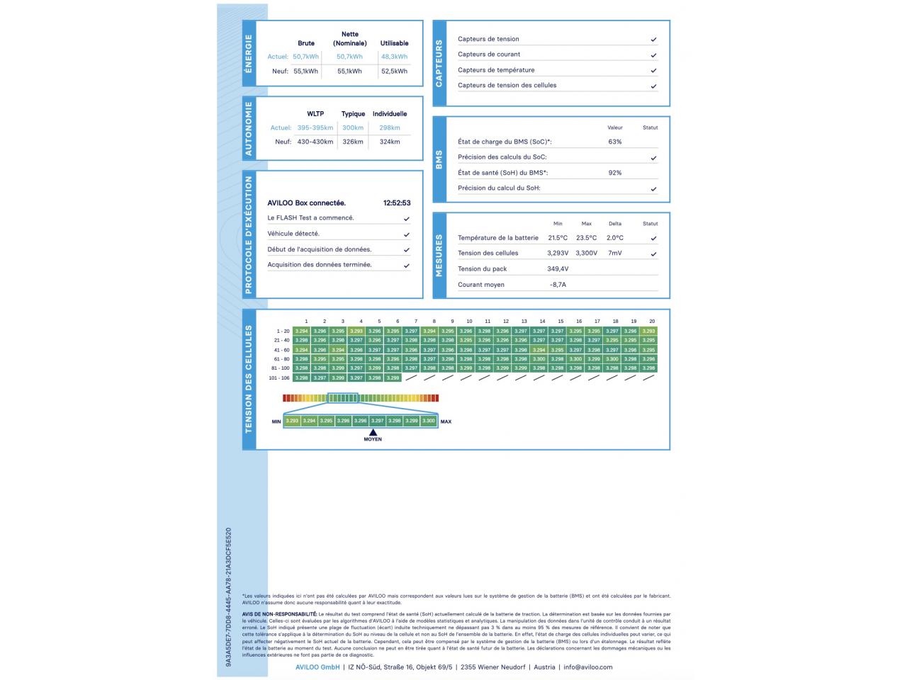 - Rapport test batterie certifié SOH "Aviloo" (détail complet dans les photos): 92 %