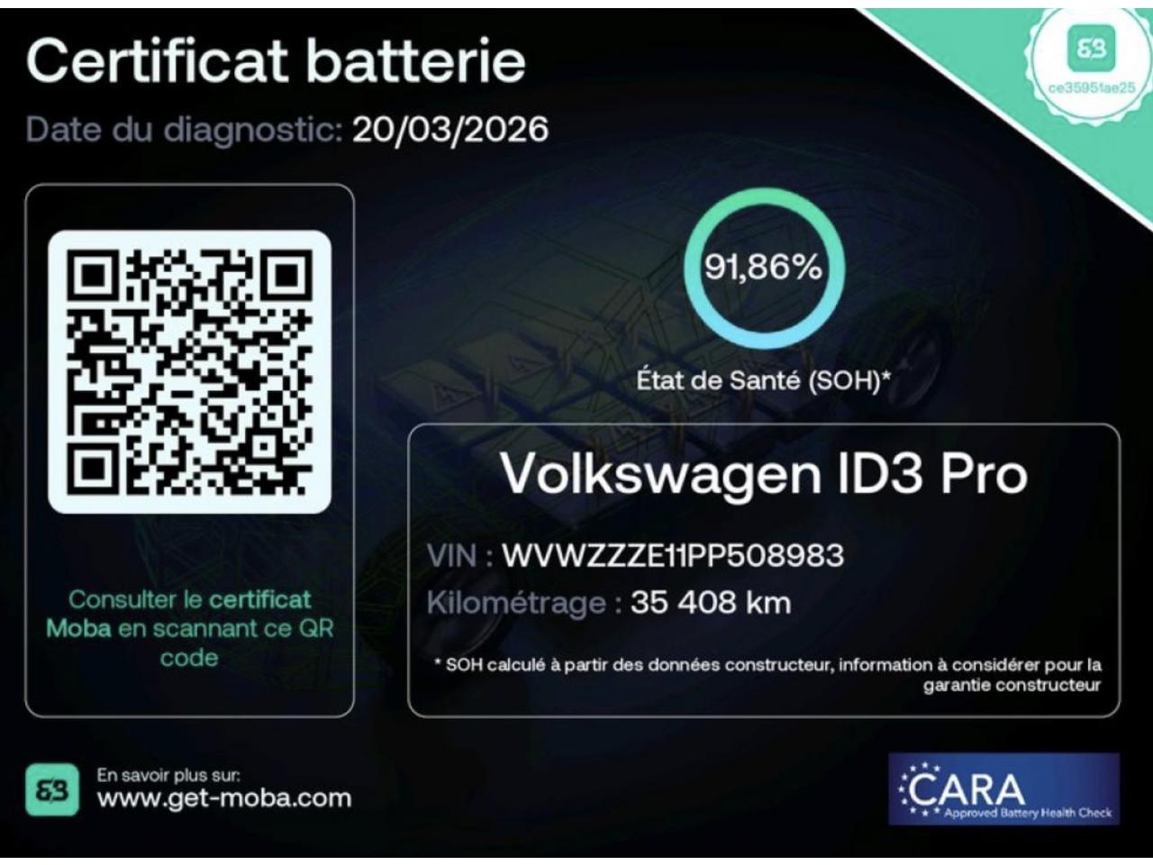 - Test batterie certifié SOH : 91 %